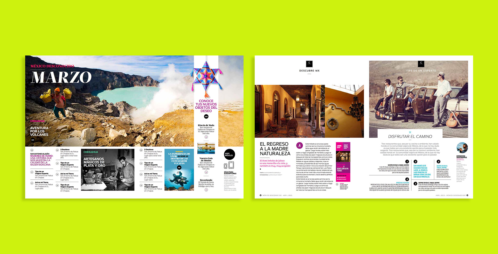 México Desconocido The magazine to know México’s hidden places A magazine/app that shows every month amazing places you can experience troughout Mexico. Under a redesign concept called ‘Country of Textures’, the magazine looks fresher and bolder, with a texturized navigation according to the region or zone of the article recommends, a better use of photos (they have AMAZING photography), controlled white space and exclusive content (including a new custom-typography), Mexico Unknown gained a younger audience and more clients. Client: G21/ Iasa Comunicación Website: g21.com.mx Services: Branding , Design, Art Direction, App, Print Launch website